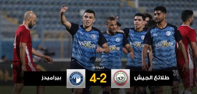 حقق بيراميدز فوزا بنتيجة 4-2 على طلائع الجيش في الجولة 34 من الدوري المصري في لقاء أقيم على استاد الدفاع الجوي.
